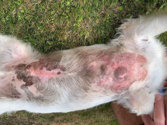 When Jasper first came to us, his skin was severely inflamed—red, raw, itchy, and noticeably odorous. He was also experiencing some incontinence, which added to his discomfort. After a thorough consultation that explored both his symptoms and personality, we sent out his initial remedies.