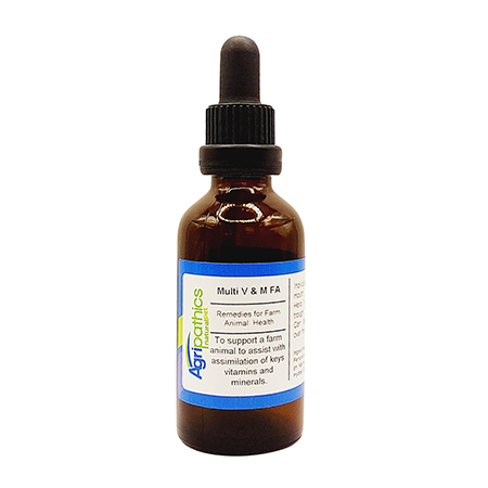Multi V&M is supplied in liquid form, which we find to be the easiest and most effective method of administration for all farm animals. Homoeopathic remedies can be given directly into the animal's mouth, added to feed, or mixed into drinking water. All methods are equally effective.